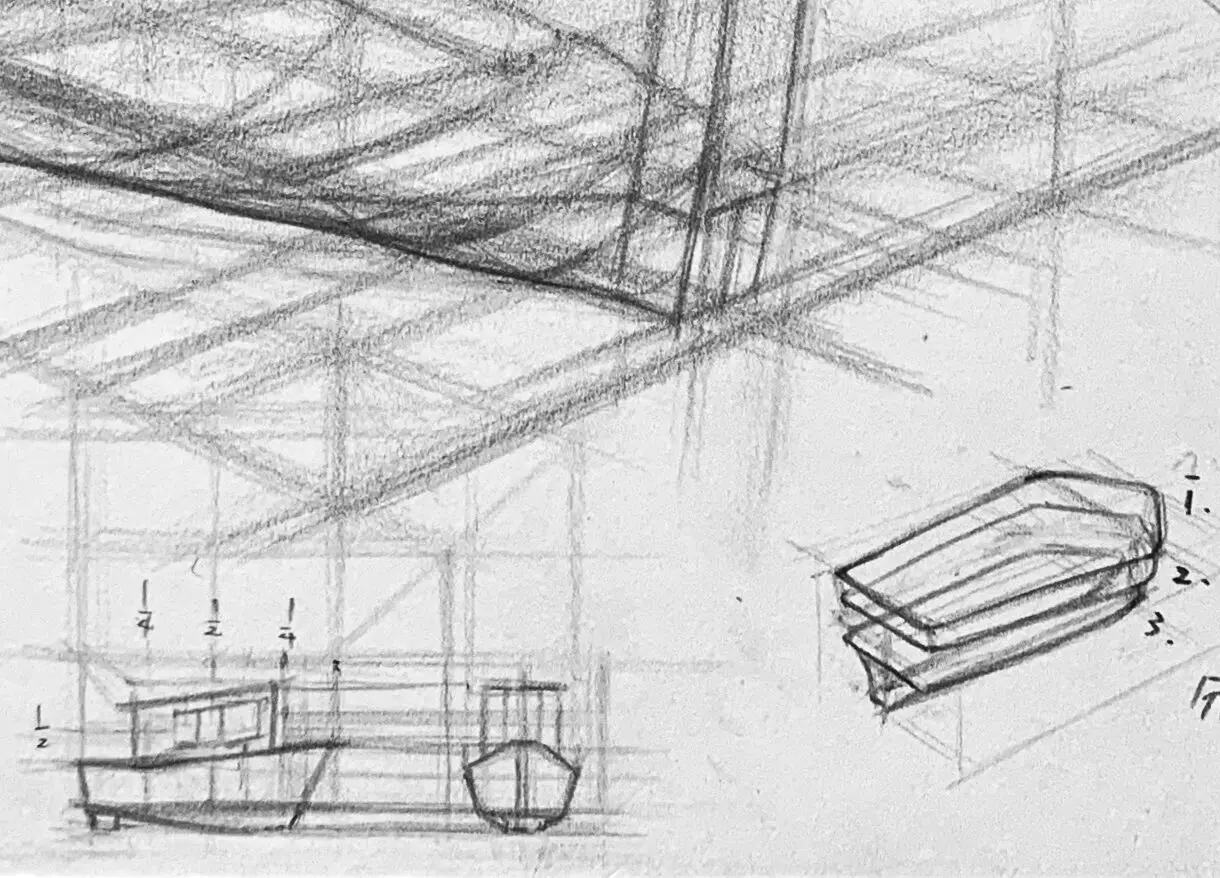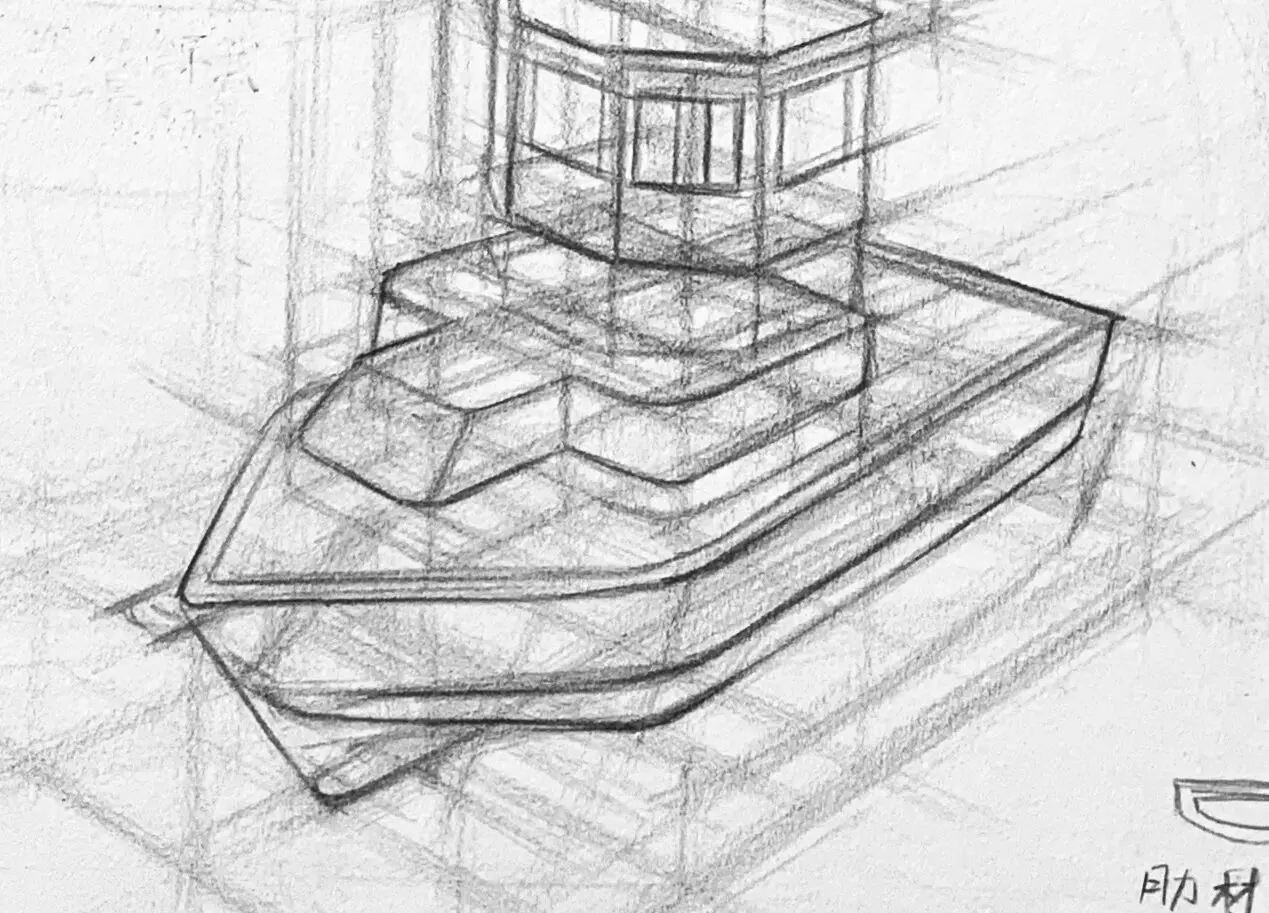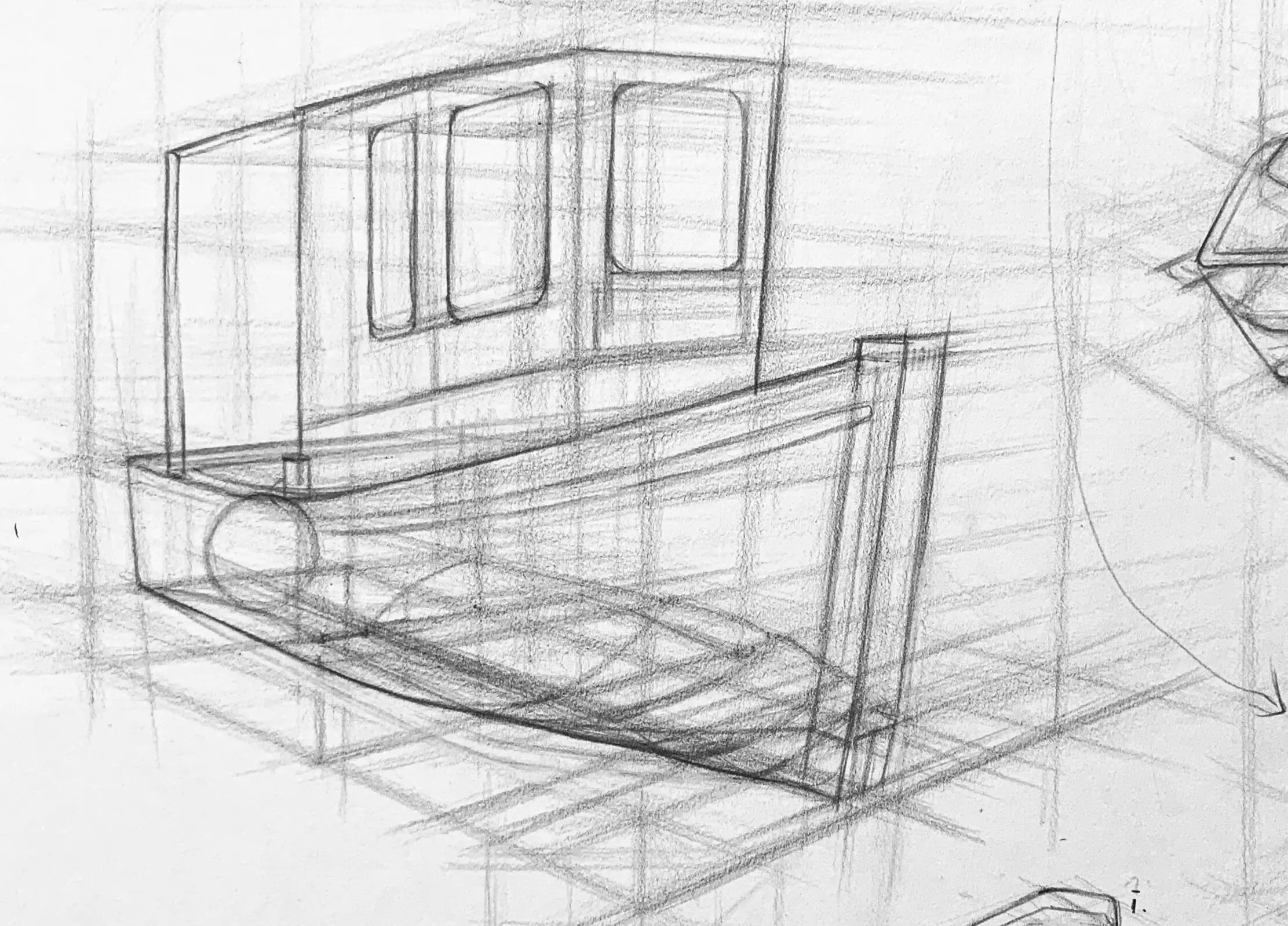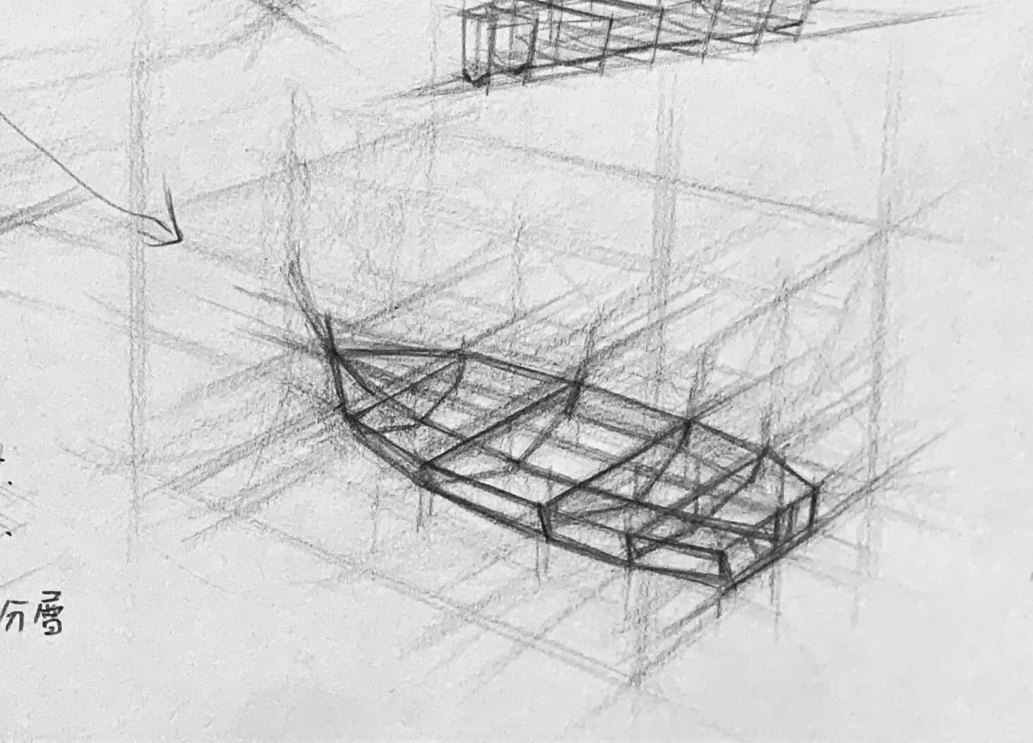 我們從基礎的長方體開始,再逐步透過結構透視線推敲出形狀,最後完成透視效果的船隻結構圖。