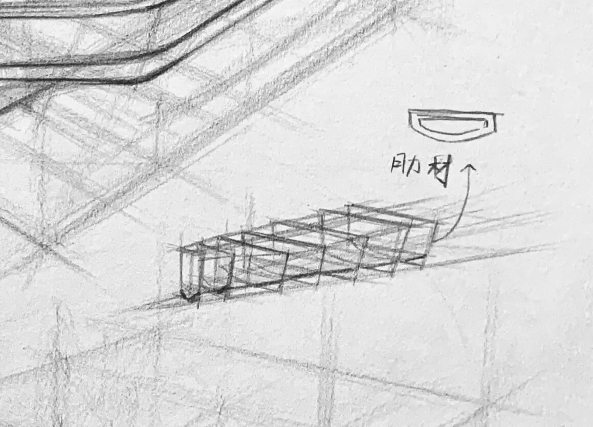 船的基礎結構像是肋骨的樣式,由一系列縱向和橫向的梁組成,支撐船的外形和穩定性。