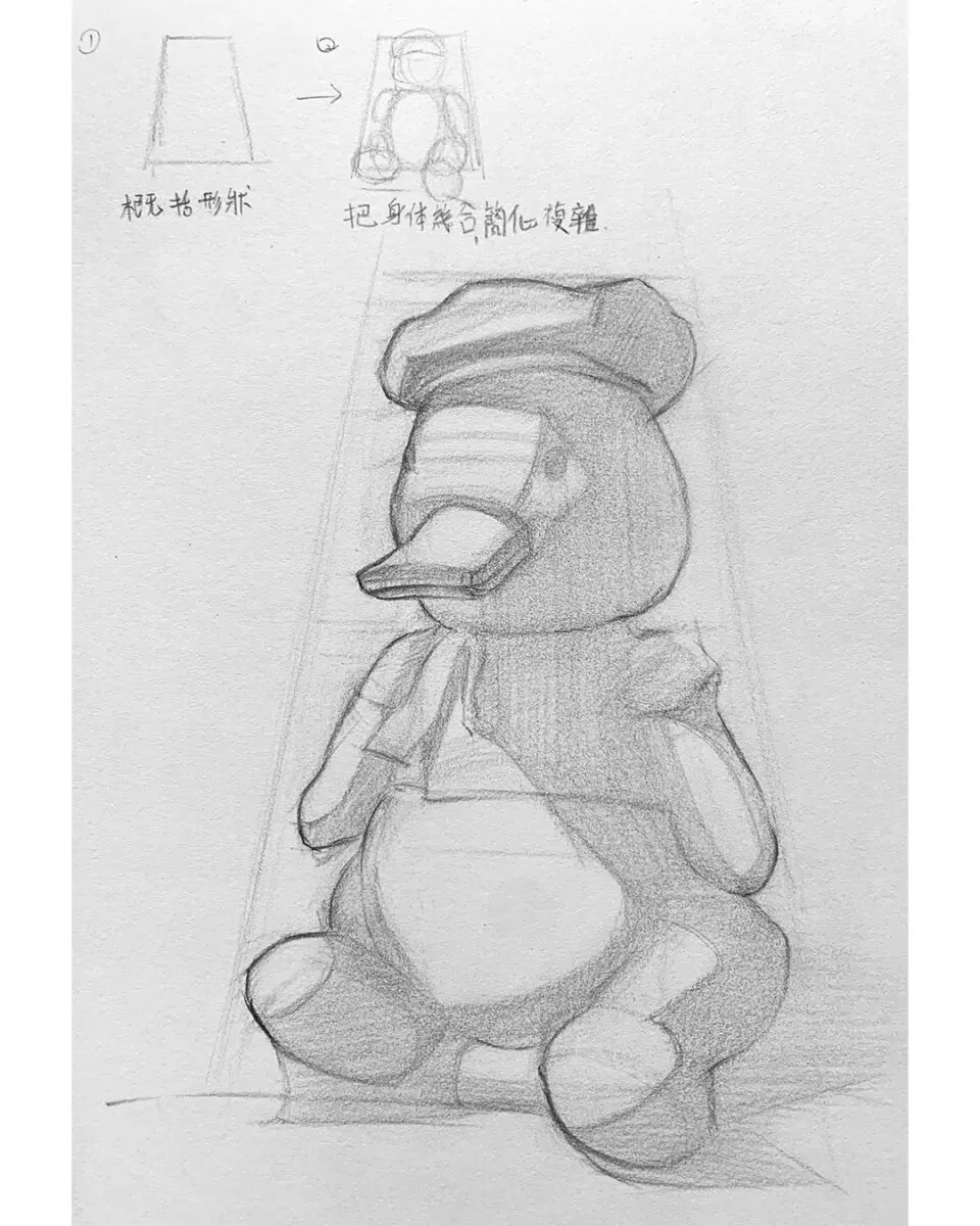 首先,用簡單的幾何形狀(如梯形)來確定鴨子的整體外形。這樣有助於確保整體比例和大概外形。