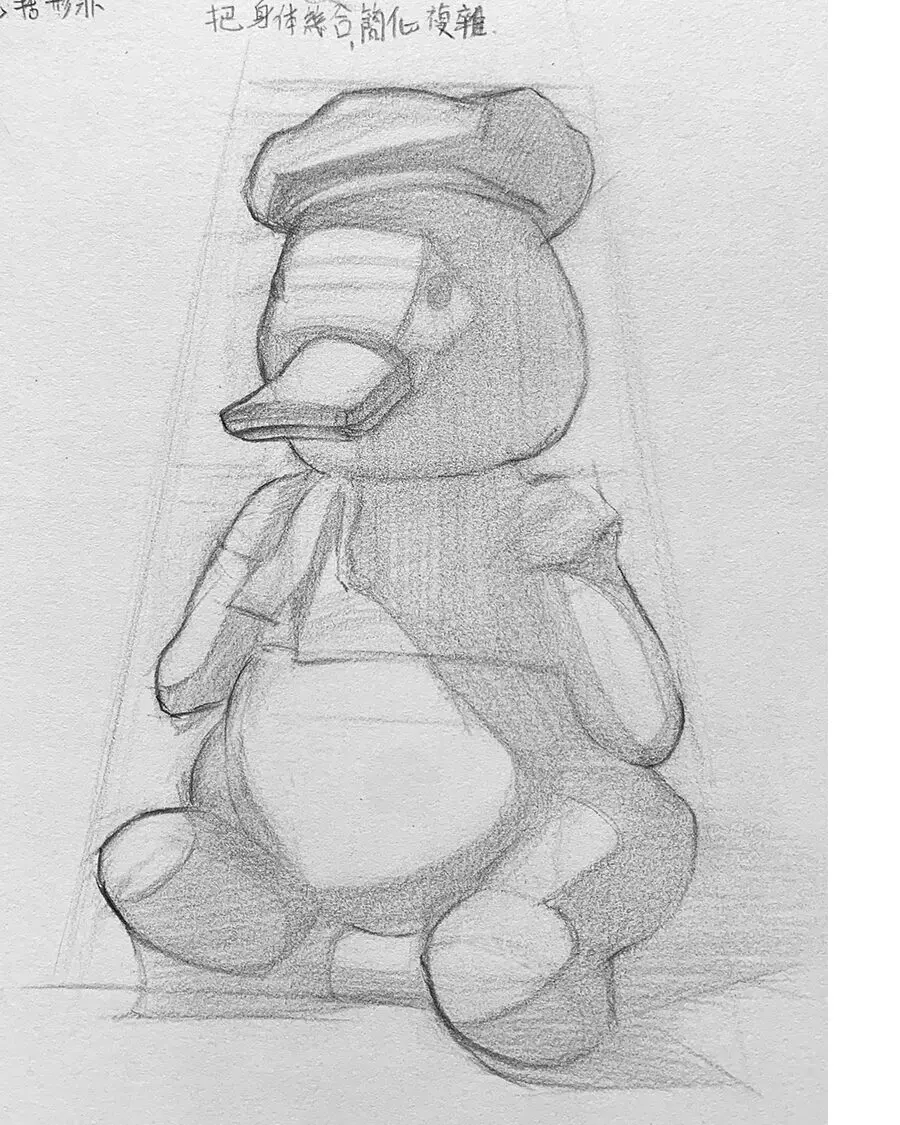接著,在梯形內部添加圓形和橢圓形,將鴨子玩偶的各部分(如頭、身體、手臂、腿)簡化成基本形狀,這一步有助於更好地掌握各圓形之間大小的關係。