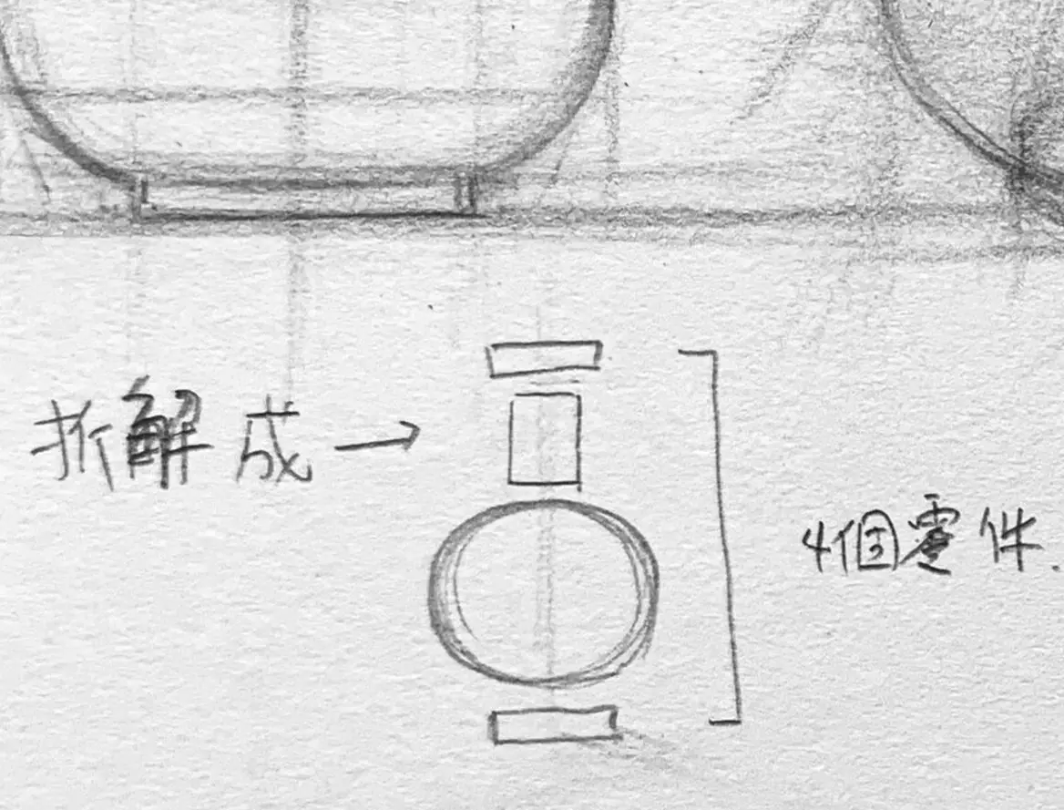 將物體分解為基本幾何體,如圓形、長方形等等構成,像是球體上裝著圓柱,請看左上的小圖。