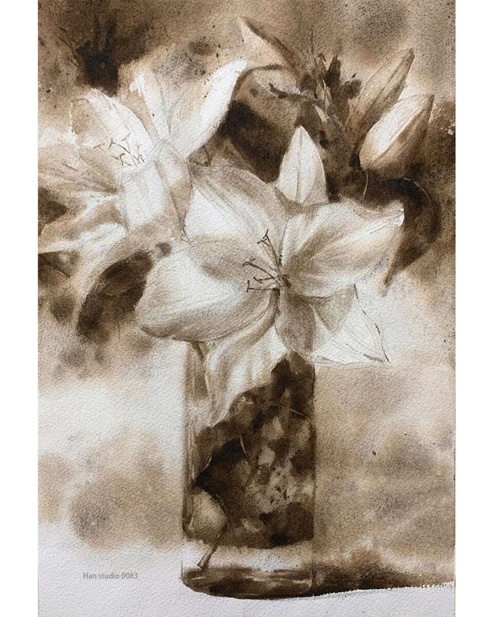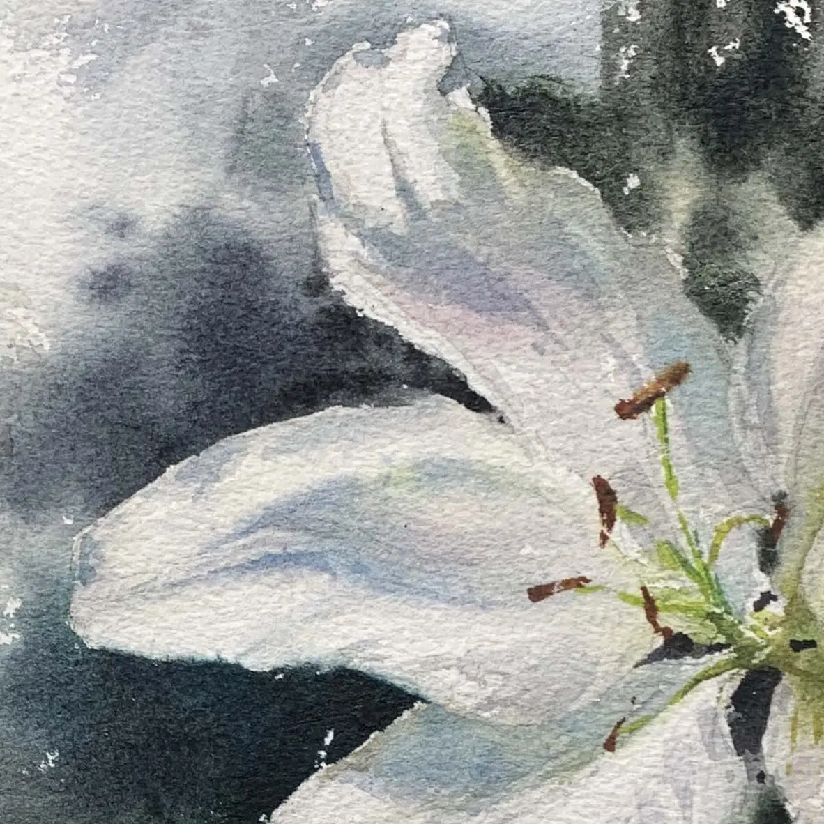 淺色甚至不畫背景,適合中灰明度(亮度)百合,可以讓在畫面具焦在花轉折表現上。
